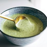 Gold spoon dips into bowl of aji verde