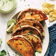 - Cook Tacos: Heat some oil or butter in a skillet over medium heat. Fry in a skillet over medium heat, until crispy and golden brown. Dip in cilantro lime sauce. Serve with chips and salsa and a mid-week margarita. You’re welcome.